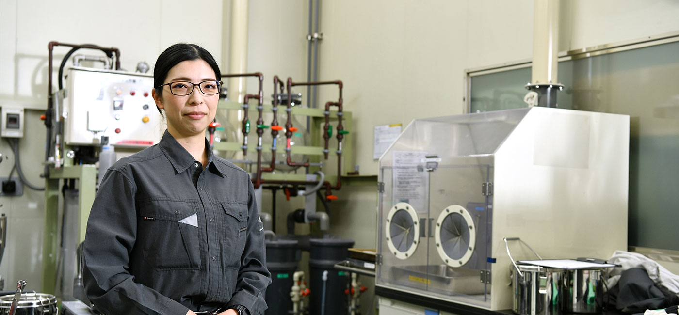 現在の業務としては主に地金加工に携わっています。具体的には貴金属微粉末の製造(機械のオペレーションやサンプリング)、出荷準備(梱包や入力業務)、貴金属板材の検品業務等が挙げられます。